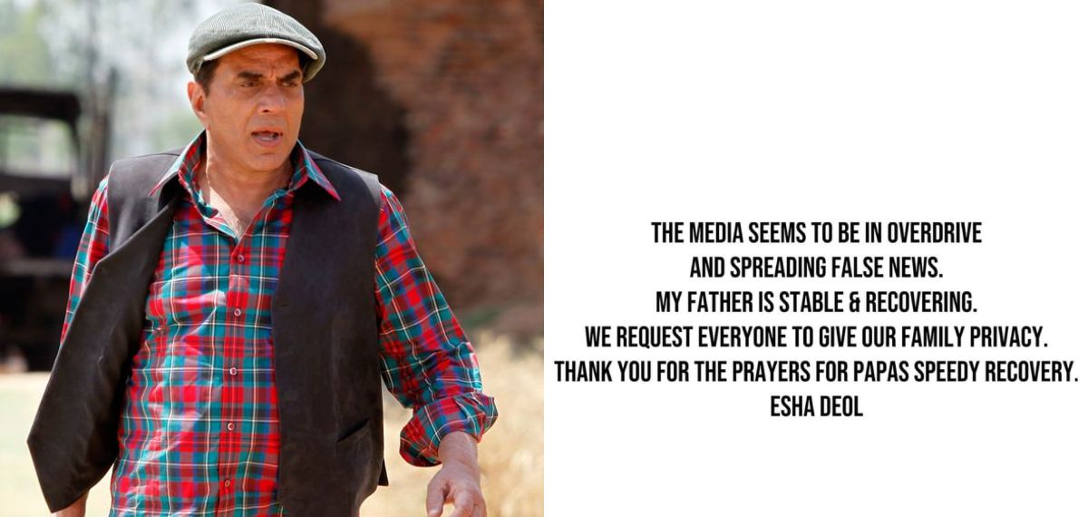 നടൻ ധർമേന്ദ്രയുടെ മരണവാർത്ത തള്ളി കുടുംബം. ധർമേന്ദ്രയുടെ നില തൃപ്തികരമാണെന്നും തെറ്റായ വാർത്തകൾ പ്രചരിപ്പിക്കരുതെന്നും മകൾ ഇഷ ഡിയോൾ സോഷ്യൽ മീഡിയയിലൂടെ അറിയിച്ചു. പപ്പയുടെ രോഗശാന്തിക്കായി പ്രാർത്ഥനകൾ നടത്തിയതിന് നന്ദി എന്നും ഇഷ കൂട്ടിച്ചേർത്തു.