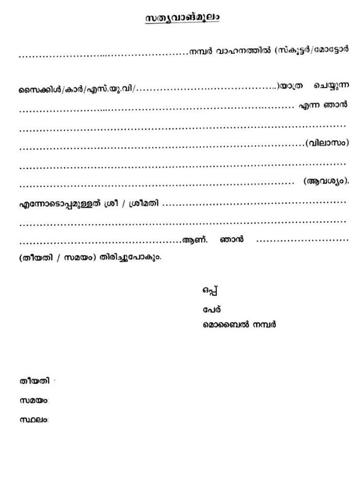 സത്യവാങ്മൂലത്തിന്റെ മാതൃക:പ്രിന്റ് എടുക്കാൻ സാധിക്കാത്തവർക്ക് ഈ മാതൃക എഴുതി നൽകാവുന്നതാണ്