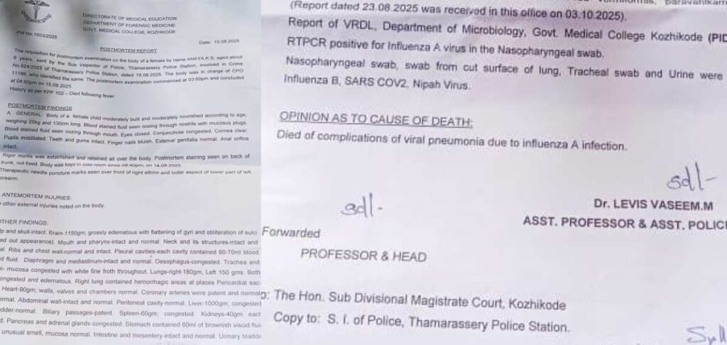 ഇതിന് പിന്നാലെ പോസ്റ്റ്മോര്ട്ടം റിപ്പോര്ട്ട് ആവശ്യപ്പെട്ട് കുടുംബം കോഴിക്കോട് മെഡിക്കല് കോളേജ് ആശുപത്രിയെ സമീപിച്ചിരുന്നു. എന്നാല് പോസ്റ്റ്മോര്ട്ടം റിപ്പോര്ട്ട് ആയിട്ടില്ലെന്നായിരുന്നു അധികൃതര് അറിയിച്ചത്. ഇതിനിടെ ഫോറന്സിക് ഡിപ്പാര്ട്ട്മെന്റിലെ ഒരു ഡോക്ടര് കുട്ടിയുടെ മാതാവിനെ കാണുകയും മരണകാരണം മസ്തിഷ്ക ജ്വര ബാധയല്ലെന്നും പറഞ്ഞിരുന്നു. ഇതിന് പിന്നാലെ സനൂപ് അസ്വസ്ഥനായിരുന്നുവെന്ന് ഭാര്യ മാധ്യമങ്ങളോട് പറഞ്ഞിരുന്നു.