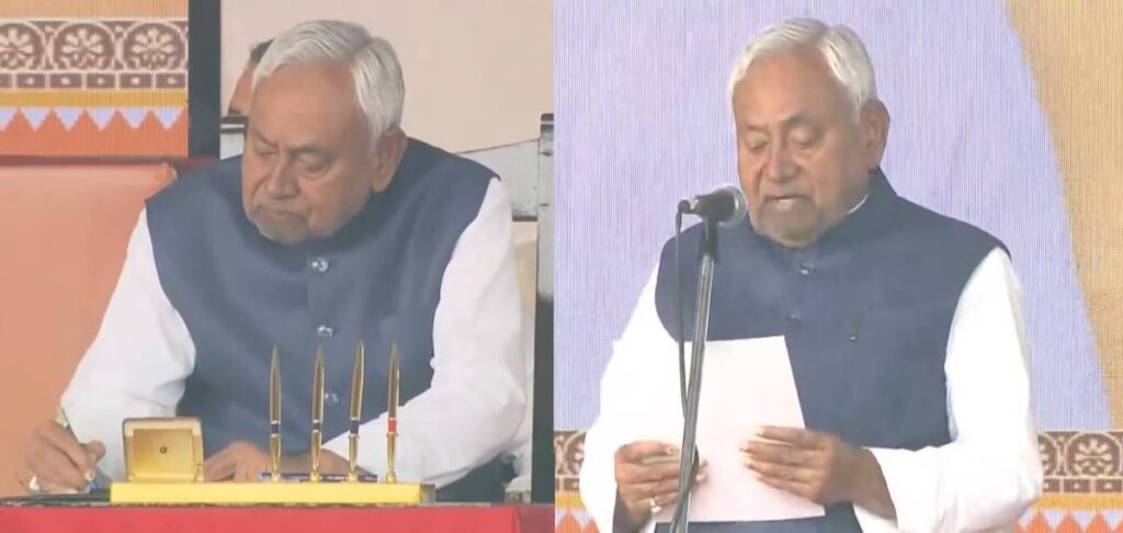 പാട്ന: ബിഹാര് മുഖ്യമന്ത്രിയായി പത്താമതും സത്യപ്രതിജ്ഞ ചെയ്ത് നിതീഷ് കുമാര്. ഗവര്ണര് ആരിഫ് മുഹമ്മദ് ഖാന് സത്യവാചകം ചൊല്ലിക്കൊടുത്തു. പ്രധാനമന്ത്രി നരേന്ദ്ര മോദി, കേന്ദ്ര ആഭ്യന്തര മന്ത്രി അമിത് ഷാ, ജെ പി നദ്ദ, ചന്ദ്രബാബു നായിഡു അടക്കമുള്ള നേതാക്കള് സത്യപ്രതിജ്ഞാ ചടങ്ങില് പങ്കെടുത്തു. സാമ്രാട്ട് ചൗധരി, വിജയ് സിന്ഹ, വിജയ് കുമാര് ചൗധരി തുടങ്ങിയവര് സത്യപ്രതിജ്ഞ ചെയ്തു.