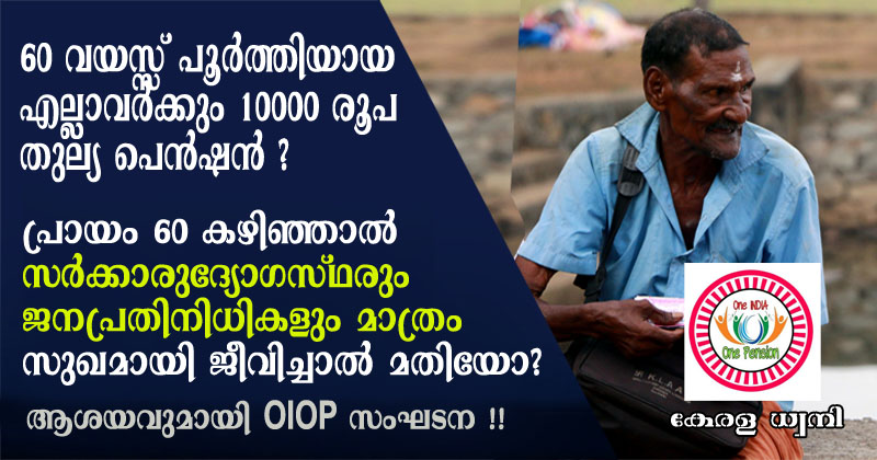 കോട്ടയം: 60 വയസ്സ് പൂർത്തിയായ എല്ലാ ഇന്ത്യക്കാർക്കും – ജാതി, മത, വർഗ്ഗ, വർണ്ണ, ലിംഗ, രാഷ്ട്രീയ, തൊഴിൽ, വിദ്യാഭ്യാസ വ്യത്യാസമില്ലാതെ 10000/- രൂപ പ്രതിമാസ പെൻഷൻ അനുവദിക്കുക എന്ന തുല്യ പെൻഷൻ ആശയം ഇന്നു കോറോണയെക്കാൾ വേഗത്തിൽ സോഷ്യൽ മീഡിയയിൽ ഇന്ത്യയിൽ പടർന്നു കൊണ്ടിരിക്കുകയാണ് .ഓ ഐ ഓ പി (OIOP) എന്ന സംഘടനയാണ് ഈ ആശയം മുൻപോട്ട് വയ്ക്കുന്നത്.