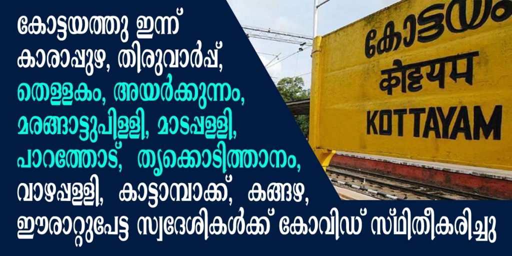 11. മംഗലാപുരത്തുനിന്ന് ജൂണ് 28ന് എത്തി ഹോം ക്വാറന്റയിനില് കഴിഞ്ഞിരുന്ന തിരുവാര്പ്പ് സ്വദേശി(40). രോഗലക്ഷണങ്ങള് ഉണ്ടായിരുന്നു.