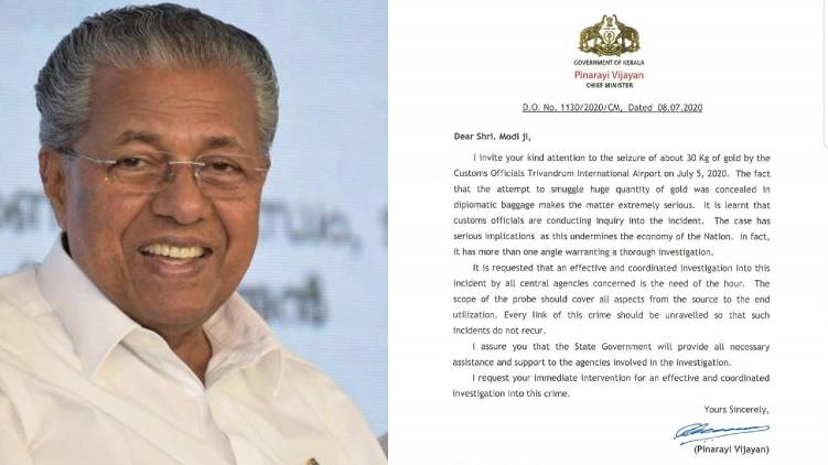 സ്വർണക്കടത്ത്  കേസിൽ ഫലപ്രദമായ അന്വേഷണം നടത്താൻ അടിയന്തര ഇടപെടൽ ആവശ്യപ്പെട്ട് പ്രധാനമന്ത്രിക്ക് കത്തയച്ച് മുഖ്യമന്ത്രി പിണറായി വിജയൻ