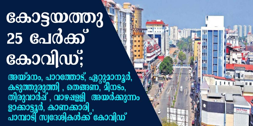 കോട്ടയം ജില്ലയില് 25 പേര്ക്കു കൂടി പുതിയതായി കോവിഡ് സ്ഥിരീകരിച്ചു. ഇതില് നാലു പേര്ക്ക് സമ്പര്ക്കം മുഖേനയാണ് രോഗം ബാധിച്ചത്. 15 പേര് വിദശത്തുനിന്നും ആറു പേര് മറ്റു സംസ്ഥാനങ്ങളില്നിന്നും വന്നവരാണ്.