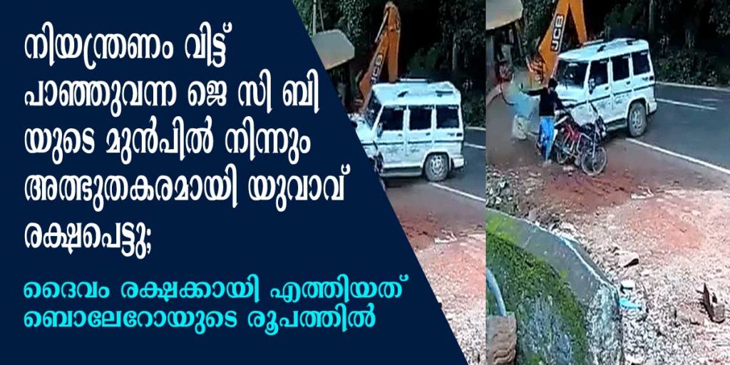 നിയന്ത്രണം നഷ്ടപ്പെട്ട് കടന്നെത്തിയ ജെ.സി.ബി എതിർ സൈഡിൽ നിന്ന ബൈക്ക് യാത്രികന്റെ അടുത്തേക്ക് പാഞ്ഞ് എത്തിയപ്പോഴാണ് രക്ഷകന്റെ റോളിൽ ഒരു ബൊലേറോ ഓടിയെത്തിയത്. ജെ.സി,ബി ബൊലേറോയിൽ ഇടിച്ച് തെറിപ്പിക്കുകയായിരുന്നു. ഇടിയുടെ ആഘാതത്തിൽ യുവാവ് തെറിച്ച് വീണെങ്കിലും ഒന്നും സംഭവിച്ചില്ല.
