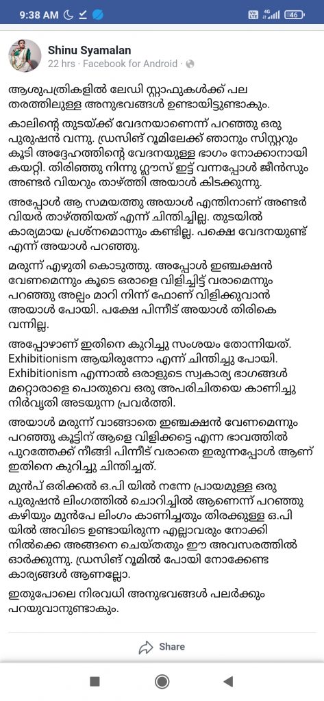 ആശുപത്രികളിൽ ലേഡി സ്റ്റാഫുകൾക്ക് പല തരത്തിലുള്ള അനുഭവങ്ങൾ ഉണ്ടായിട്ടുണ്ടാകും. കാലിന്റെ തുടയ്ക്ക് വേദനയാണെന്ന് പറഞ്ഞു ഒരു പുരുഷൻ വന്നു. ഡ്രസിങ് റൂമിലേക്ക് ഞാനും സിസ്റ്ററും കൂടി അദ്ദേഹത്തിന്റെ വേദനയുള്ള ഭാഗം നോക്കാനായി കയറ്റി. തിരിഞ്ഞു നിന്നു ഗ്ലൗസ് ഇട്ട് വന്നപ്പോൾ ജീൻസും അണ്ടർ വിയറും താഴ്ത്തി അയാൾ കിടക്കുന്നു.