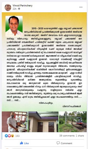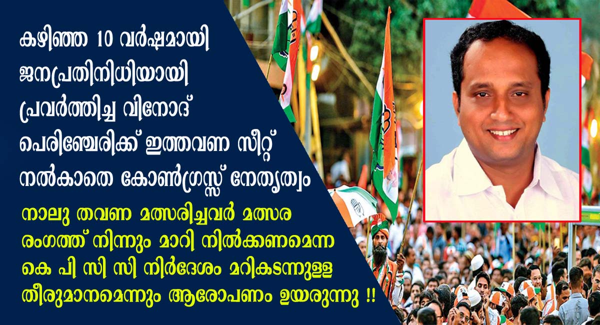 ഇത്തവണത്തെ ഇലക്ഷനിൽ നിന്നും മാറി നില്ക്കാൻ കോൺഗ്രസ്സ് നേതൃത്വം വിനോദ് പെരിഞ്ചേരിയോട് ആവശ്യപ്പെട്ടതായാണ് അറിയുവാൻ കഴിയുന്നത്. ഏതെങ്കിലും അഴിമതി, സ്വാർത്ഥ താൽപര്യക്കാരുടെ സമ്മർദത്തിന് വഴങ്ങിയാണോ ഇത്തരത്തിലൊരു തീരുമാനം കൈക്കൊള്ളുന്നതെന്ന് പാർട്ടി നേതൃത്വം പരിശോധിക്കേണ്ടത് ആവശ്യമാണ് .