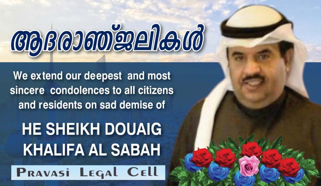 കുവൈറ്റ് സിറ്റി: ഷെയ്ഖ് ദുവൈജ് ഖലീഫ അൽ സബയുടെ നിര്യാണത്തിൽ പ്രവാസി ലീഗൽ സെൽ കുവൈറ്റ് ചാപ്റ്റർ അഗാധമായ അനുശോചനം രേഖപെടുത്തി.