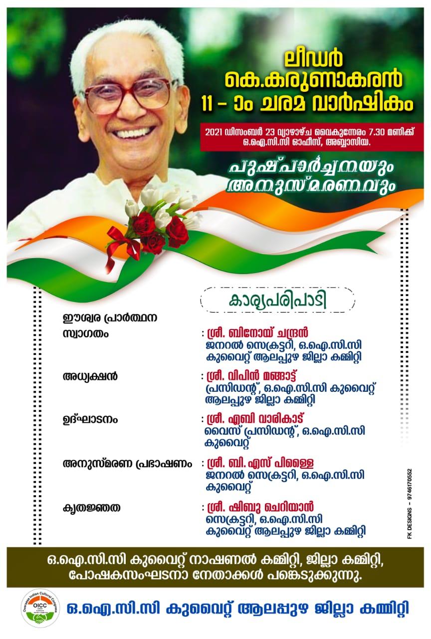 ഒഐസിസി കുവൈത്ത് ആലപ്പുഴ ജില്ലാ കമ്മിറ്റിയുടെ നേതൃത്വത്തിൽ  ലീഡർ ശ്രീ.കെ. കരുണാകരൻ പുഷ്പാർച്ചനയും അനുസ്മരണ യോഗവും