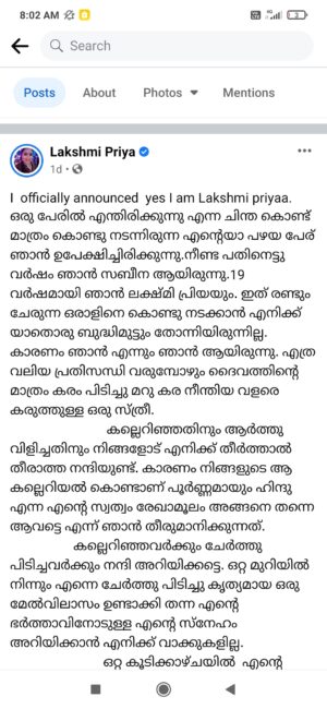 കല്ലെറിഞ്ഞതിനും ആർത്തു വിളിച്ചതിനും നിങ്ങളോട് എനിക്ക് തീർത്താൽ തീരാത്ത നന്ദിയുണ്ട്. കാരണം നിങ്ങളുടെ ആ കല്ലെറിയൽ കൊണ്ടാണ് പൂർണ്ണമായും ഹിന്ദു എന്ന എന്റെ സ്വത്വം രേഖാമൂലം അങ്ങനെ തന്നെ ആവട്ടെ എന്ന് ഞാൻ തീരുമാനിക്കുന്നത്.കല്ലെറിഞ്ഞവർക്കും ചേർത്തു പിടിച്ചവർക്കും നന്ദി അറിയിക്കട്ടെ. ഒറ്റ മുറിയിൽ നിന്നും എന്നെ ചേർത്തു പിടിച്ചു കൃത്യമായ ഒരു മേൽവിലാസം ഉണ്ടാക്കി തന്ന എന്റെ ഭർത്താവിനോടുള്ള എന്റെ സ്നേഹം അറിയിക്കാൻ എനിക്ക് വാക്കുകളില്ല.